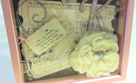 I am trying so hard to get rid of all of the "extras" that have accumlated since our wedding. I am so afraid to throw stuff away because I keep thinking "what if I want to scrapbook/display/reuse that in future?" I decided that another way for me keep some of the momentos from our wedding was to make a shadow box to hang up in my studio. (Doesn't "studio" sound so much more official than "craft room"? I think that's what I will call it from now on!) Anyway, I put this together and I think it all turned out SO pretty!